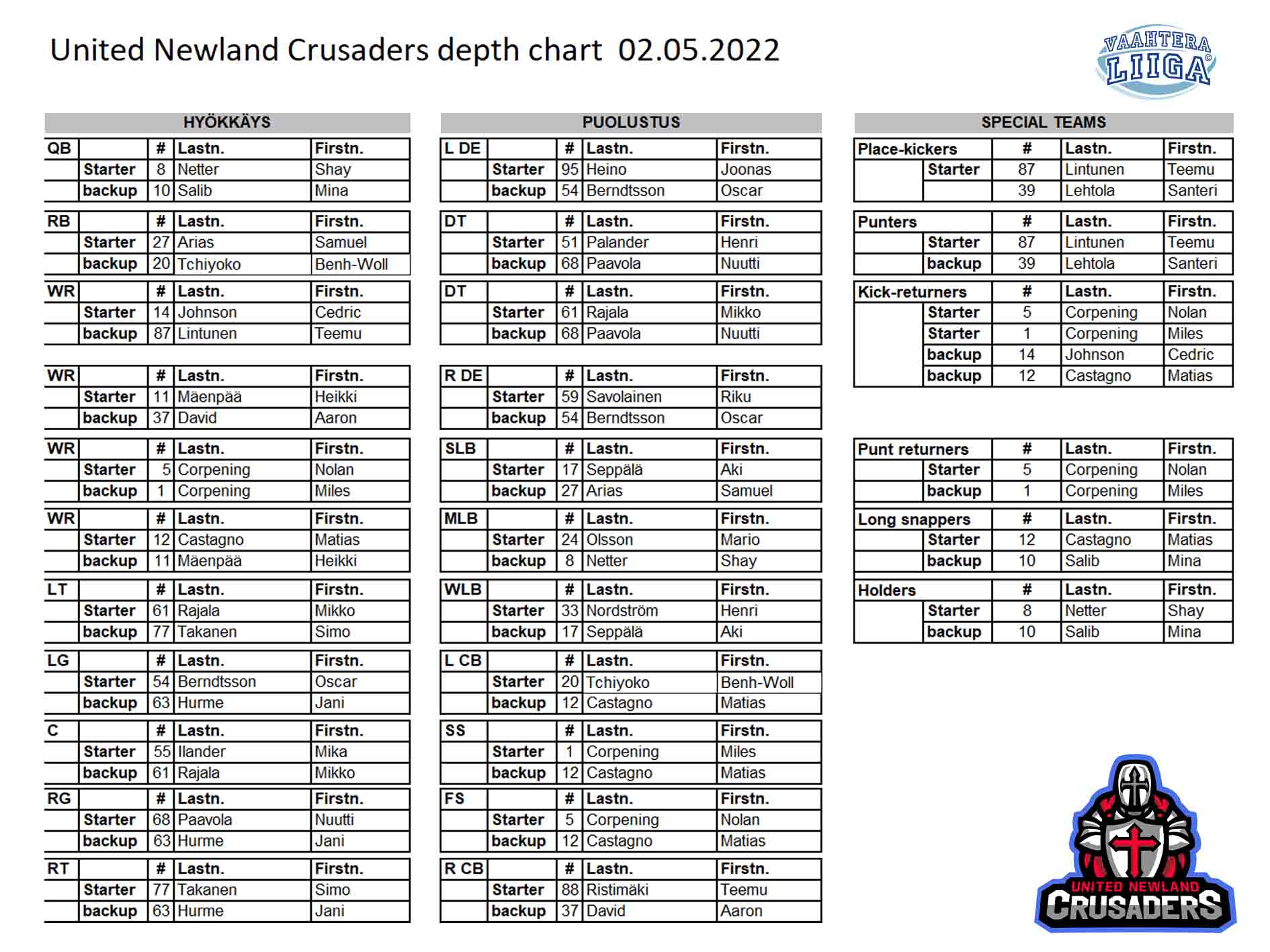 Lohjalainen Crusaders pukee alustavan rosterin perusteella torstain peliin 24 pelaajaa. Edellisessä kamppailussa näkyvästi mukana ollut unkarilaislinjamies Zalan Sorban ei ole listattuna joukkueen alustavaan rosteriin, mutta muutoin tiivis urakkaryhmä on taas kasassa.