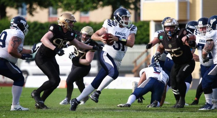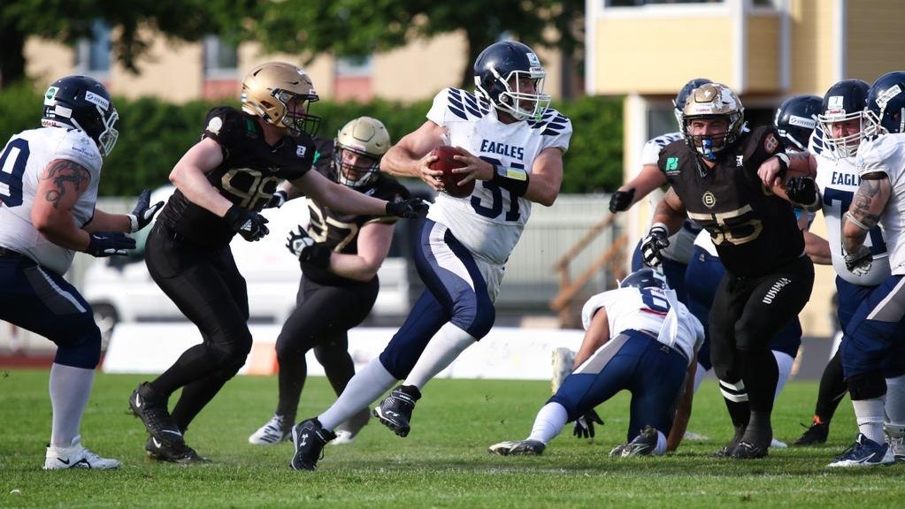 Kotka Eagles lähti peliin pelkistetyllä pelikirjalla, jonka toteuttaminen oli luontevaa vain kaksissa harjoituksissa mukana olleelle veteraanipelinrakentajalle. Nesi Carpelanin vaikutus Eaglesin taisteluilmeeseen oli pelin alussa mykistävä. Eagles taisteli molemmin puolin palloa liigassa ennen näkemättömällä intensiteetillä ja piti isäntäjoukkueen nollilla ottelun puoliväliin saakka. Ensimmäisten kahden neljänneksen aikana pelinrakentaja Carpelan heitti palloa sadan jaardin matkan ja kirjasi tilastoihin henkilökohtaisesti kaikkien aikojen ensimmäisen liigatouchdowninsa.