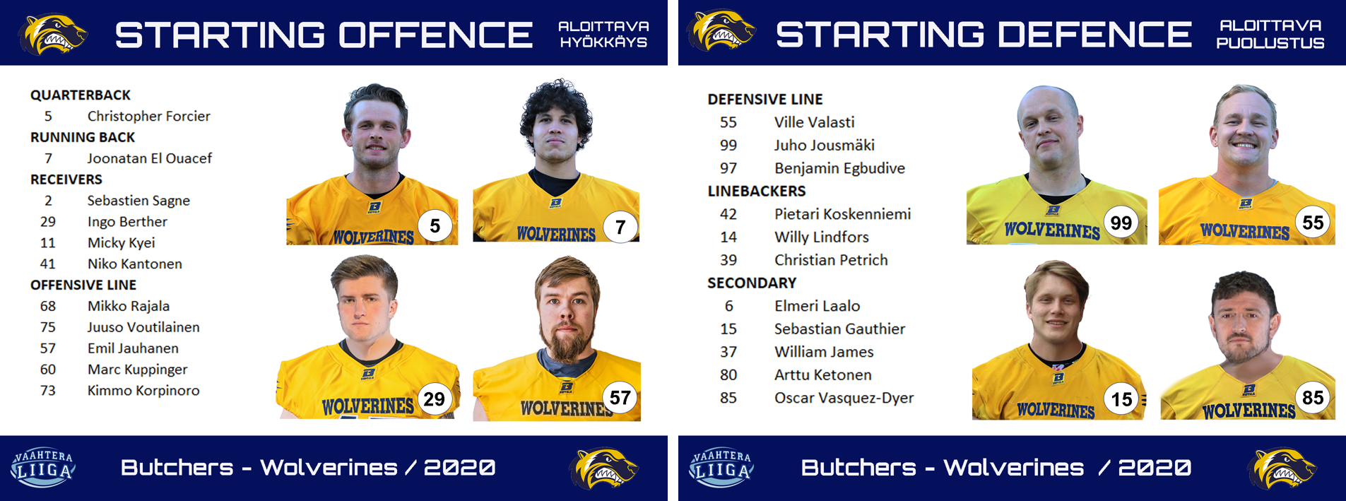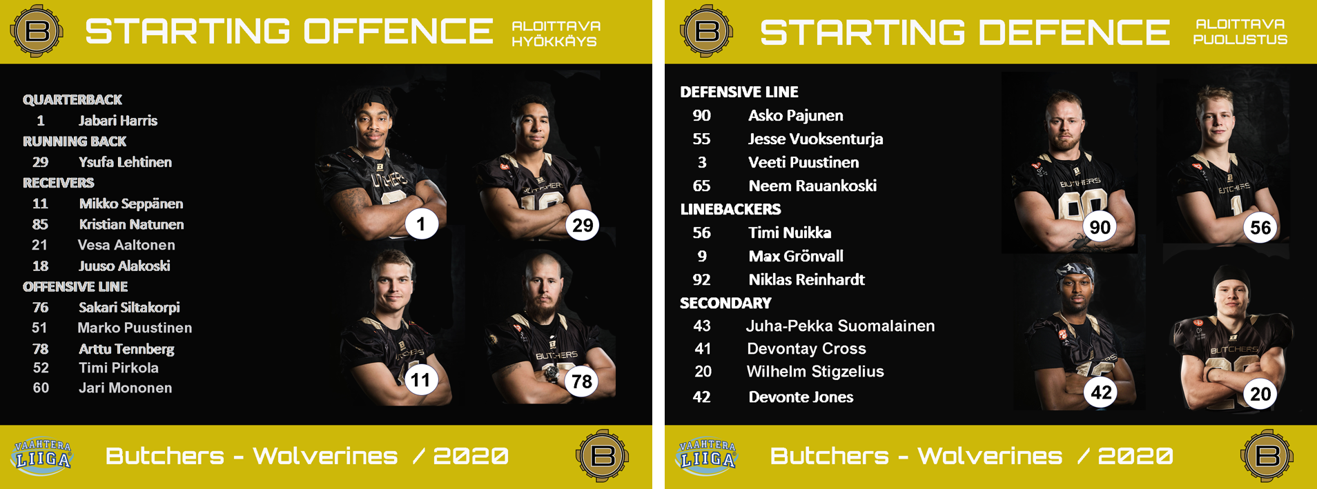 Torstai-illan kamppailuun Butchers lähtee pitkälti samalla aloituskokoonpanolla kuin Roostersia vastaan. Aloittavana keskushyökkääjänä on jälleen Ysufa Lehtinen, joka edellisessä pelissä pääsi juoksemaan pallon kanssa ainoastaan kolmesti. Toistaiseksi Jabari Harris on kerännyt joukkueensa juoksujaardeista lähes 81%. Ei siis tule olemaan yllätys, kenen pysäyttämiseen ahmat keskittyvät.