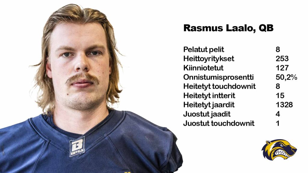 Kilpakumppani vastapuolelta, Brandon Gwinner heitti puolestaan 6 touchdownia ja yhden syötönkatkon. Jaardeja hän keräsi heitoillaan 382, onnistuen 25/38 (65.8%). Laitahyökkääjät Mikko Seppänen ja Luukas Eerola ottivat noista 5 kiinni touchdowneiksi (Seppänen 3kpl, Eerola 2kpl). Phung Nguyen otti tuon kuudennen heitetyn td:n kiinni.