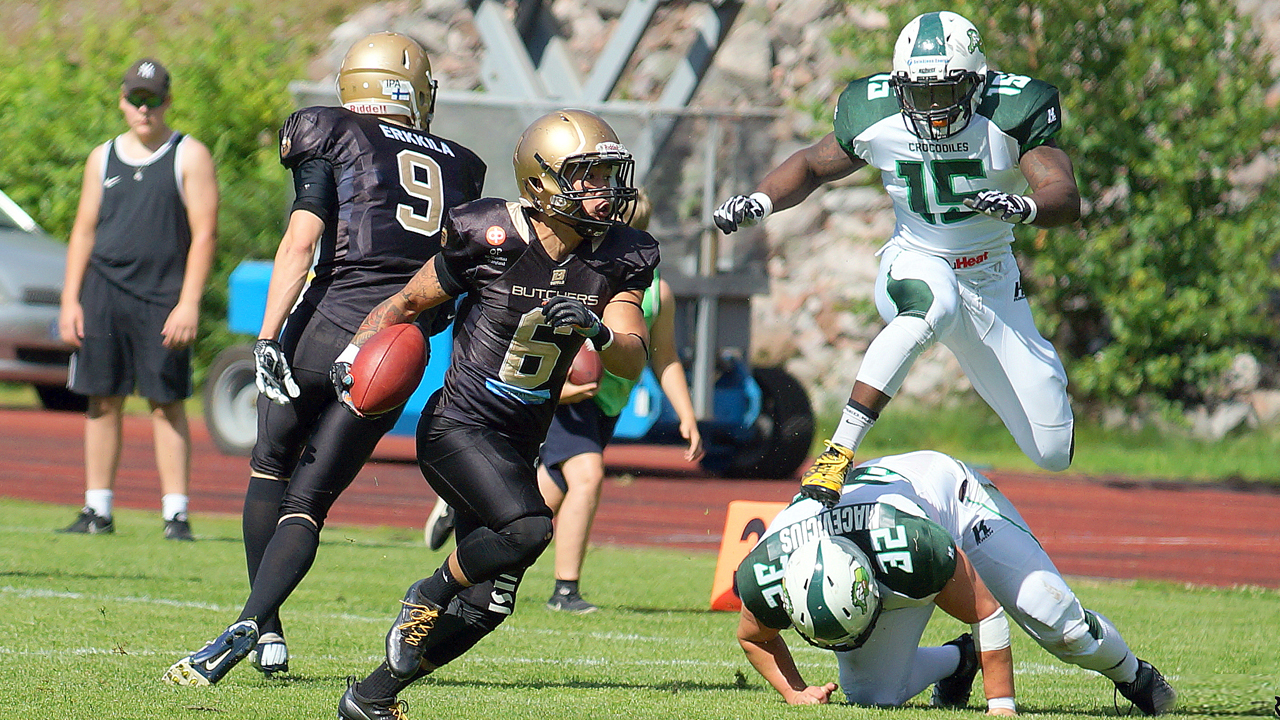 Myös Crocodiles pelasi ajoittain Butchersin Stevensin tiiviisti pois ja erityisesti Cory Magwood ja linjassa Felix N´Twa olivat lauantaina vahvoja. Muutaman pidemmän juoksun siivittämänä Stevens eteni silti tälläkin kertaa kovat lukemat: 179 jaardia ja kolme touchdownia. Kaiken kaikkiaan Butchers eteni 326 jaardia. Toisen ottelunsa pelannut pelinrakentaja Daniel Farley pelasi kliinisn ottelun. Heitot onnistuivat 75 prosentin varmuudella (12/16), maaleja syntyi kaksi eikä syötönkatkoja ainuttakaan.