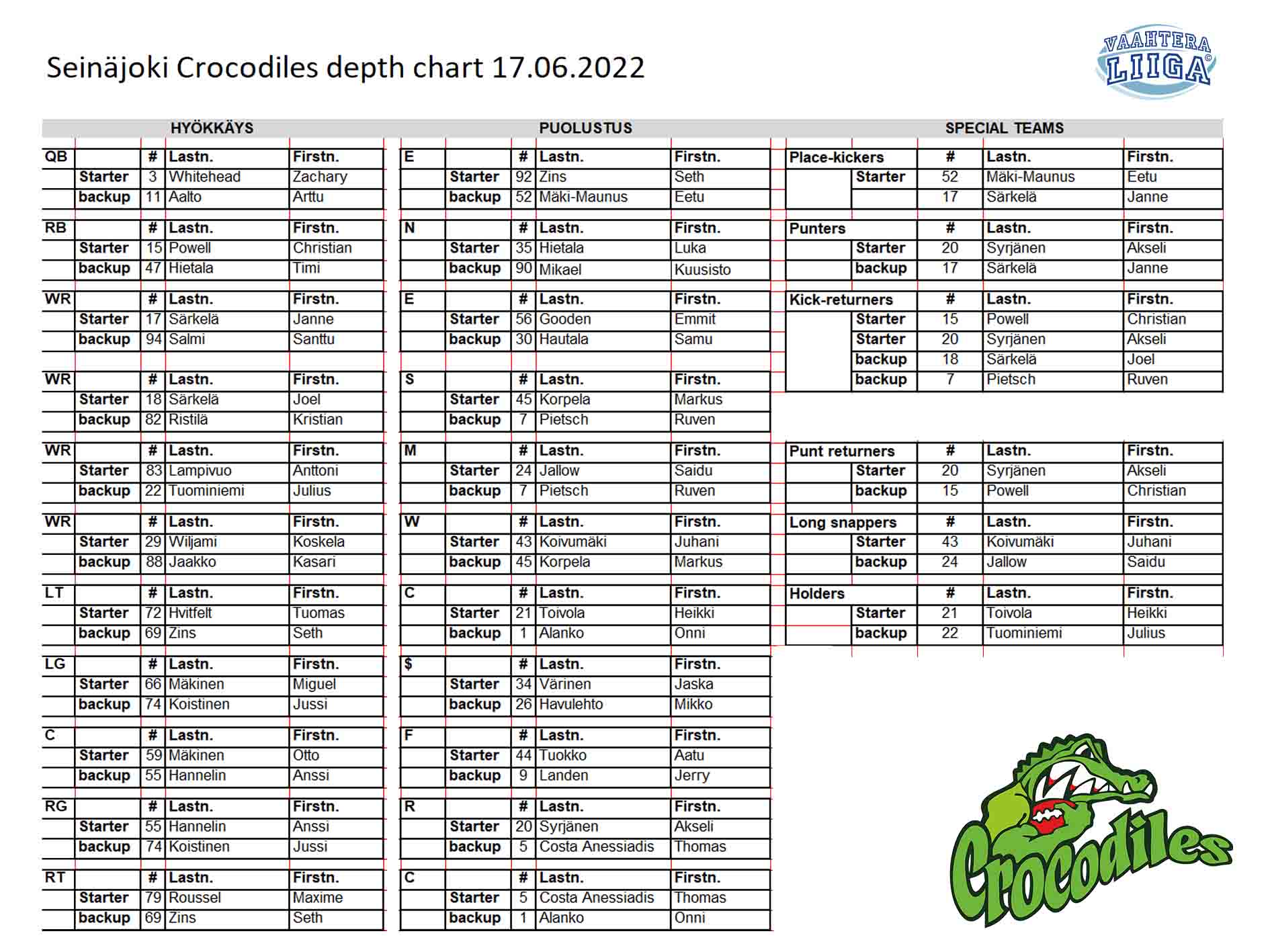 | Cro | 1-10 | at Eag44 | SEINAJOKI CROCODILES drive start at 08:20. |