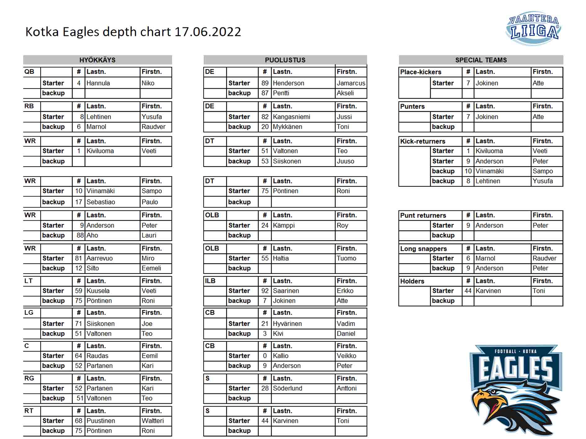 | Eag | 3-14 | at Eag16 | Hannula N pass complete to Viinamaki S for loss of 5 yards to the EAG11 (Varinen J). |