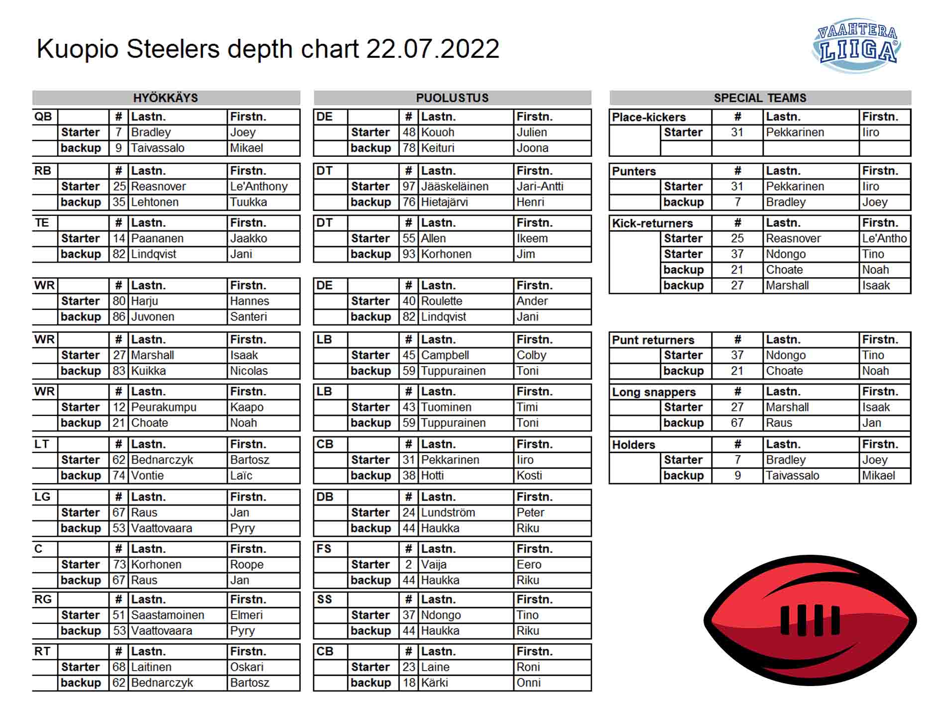 Lintunen T kickoff 35 yards to the STE30, Bakker C return 18 yards to the STE48 (Seppala A).