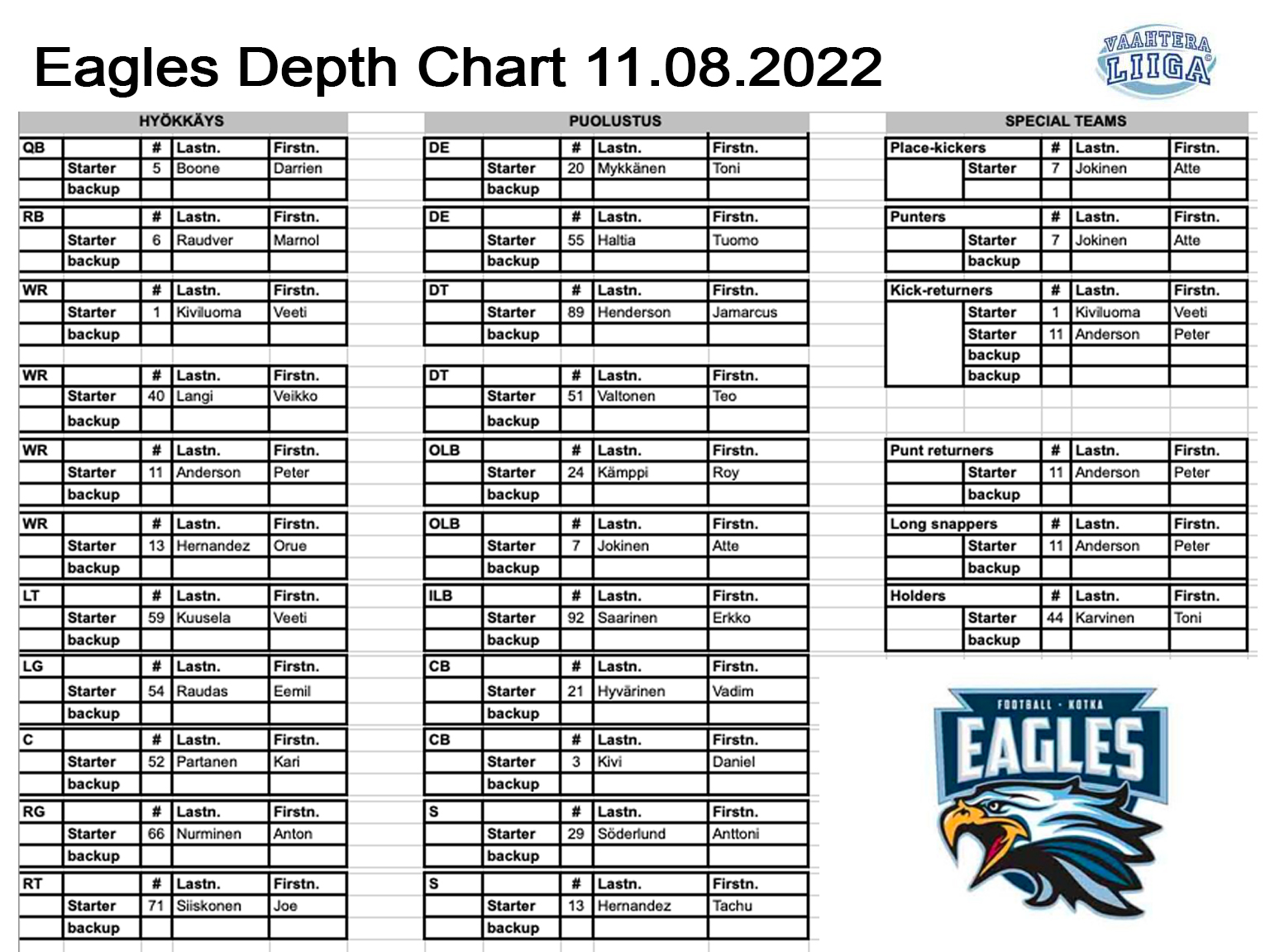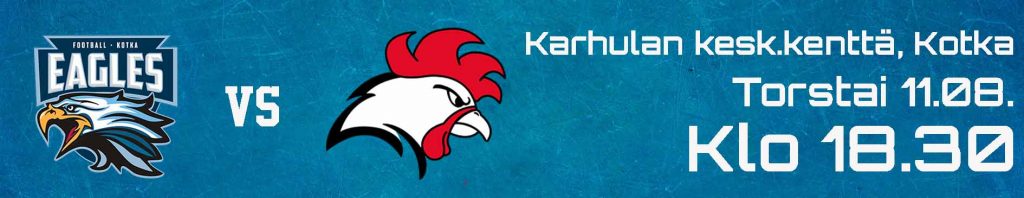 Viikko sitten Eagles sai vahvistuksia riveihinsä Kuusankoski Cowboysin II-divisioonajoukkueesta. Nyt Jani Heinisalo on nimetty epävarmaksi eikä hyökkäyksen linjan Lauri Tihulan nimeä ole kokoonpanossa lainkaan. Epävarmaksi on kirjattu myös Niko Hannula, joten kokenut espanjalainen Orue Hernandezaloittaa sekä hyökkäyksessä että puolustuksessa. Tihulan ja Waltteri Puustisen puuttuessa kokoonpanosta pelaa uransa ensimmäisen Vaahteraliiga-pelinsä suoraan aloituskokoonpanossa Kuusankosken Anton Nurminen.