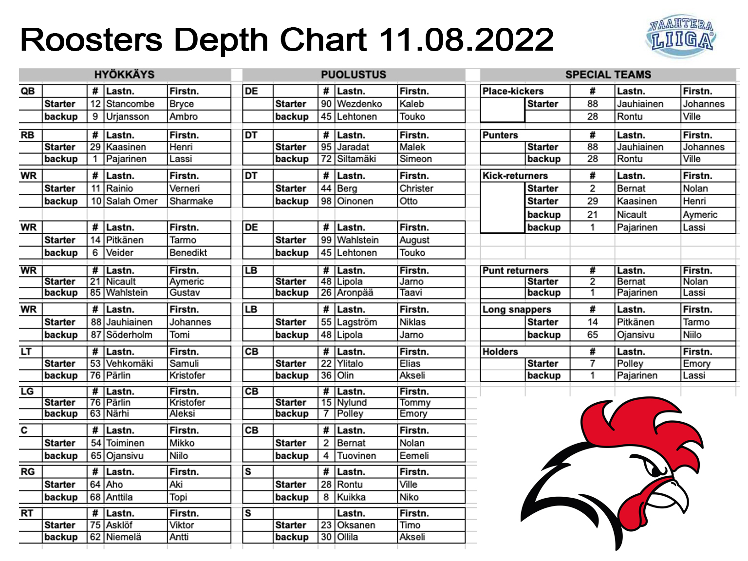 Poissaolot mahdollistavat sen, että Roosters-hyökkäyksessä nähtäneen runsaasti myös Kristian Linnainmaan ja Swarco Raidersista siirtyvän Benedikt Veiderin pelaamista. Veider kokosi Itävallan liigassa tällä kaudella yhdeksällä kiinniotolla 81 jaardia ja teki yhden touchdownin. Linnainmaa puolestaan on ansioitunut mm. lippupallomaajoukkueessa.