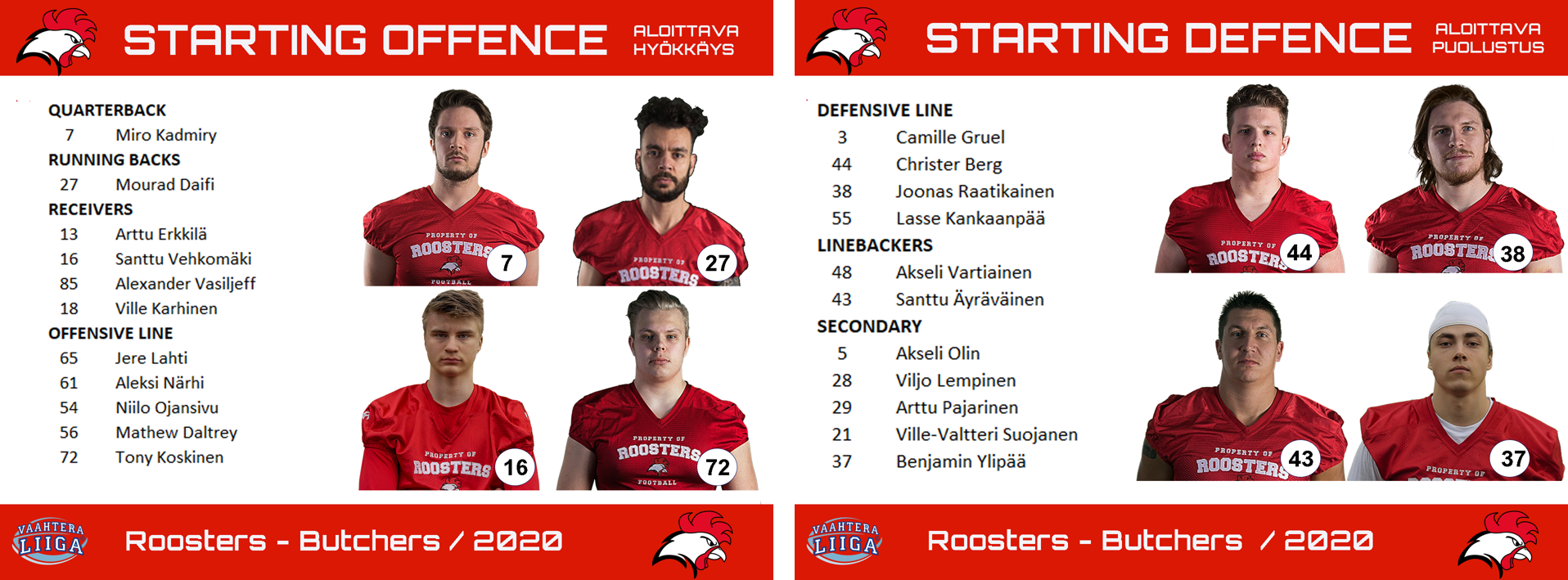 Roostersin puolustuksesta puuttuu Okko Outinen, joka on pelannut kaudella ainoastaan ensimmäisessä ottelussa Steelersia vastaan. Outinen on toistaiseksi ainoa punakoneen puolustaja, joka on onnistunut säkittämään vastustajan pelinrakentajan.
