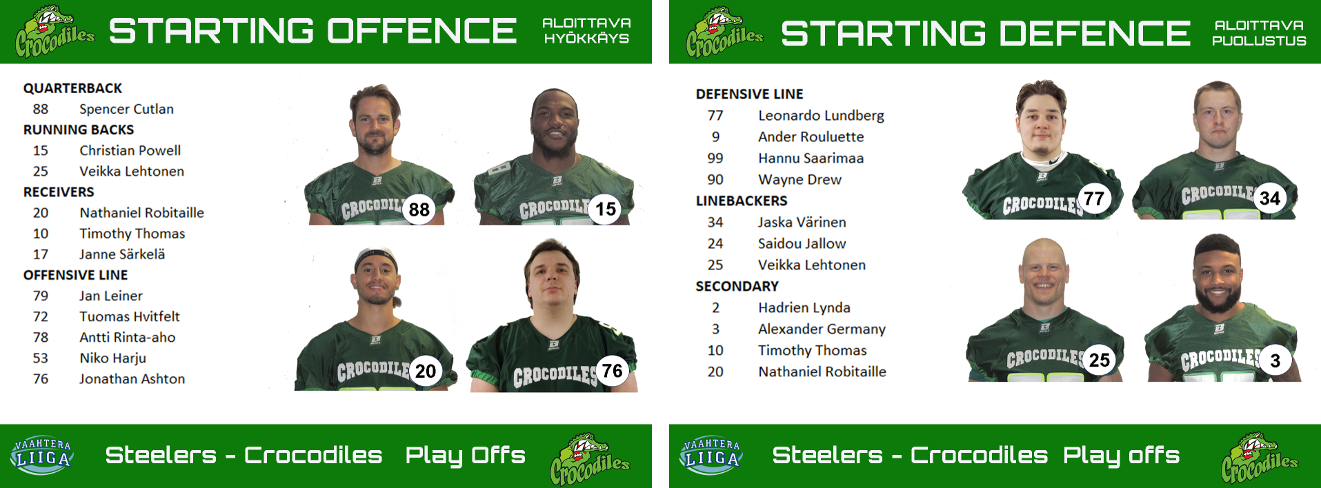 Crocodilesilla on liigan kovin keskushyökkääjä Powell (96 kantoa, 803 jaardia, 8,4 jaardin ka, 10 TD:tä, 160,6 jaardia/ottelu) jonka ympärille voidaan sanoa hyökkäyksen olevan rakennettu. Powell luo uhkan, jonka vastapainoksi aukeaa mahdollisuuksia hämäyksiin ja hyökkäykselle edullisiin asetelmiin jakaa palloa muille. Vuosia Suomessa pelannut WR/K/P Spencer Cutlan on tehnyt yllättävässä QB:n roolissaan tarpeeksi pitääkseen puolustukset poissa pelkästään Powellin kimpusta. Crocodiles juoksee suoraviivaisesti ja aggressiivisesti, hyökkäyksen linja ei ole ollut huono, FB Veikka Lehtonen on ollut erinomainen. Joukkueessa on talenttia jolle palloa voisi heittäen toimittaa, heittopeliarsenaali vaan on ymmärrettävästi pienehkö. Spread-muodostelman käytön perustana voi nähdä enemmän vartioitavan tilan kasvattamisen kuin koko kentän täyttävän heittouhan muodostamisen. Peruserona Steelersiin Crocodiles pyrkii asettamaan tempon Powellin kautta, ja mies on tarpeeksi kova väsyttämään puolustukset ja senkin kautta avaamaan mahdollisuuksia muille.