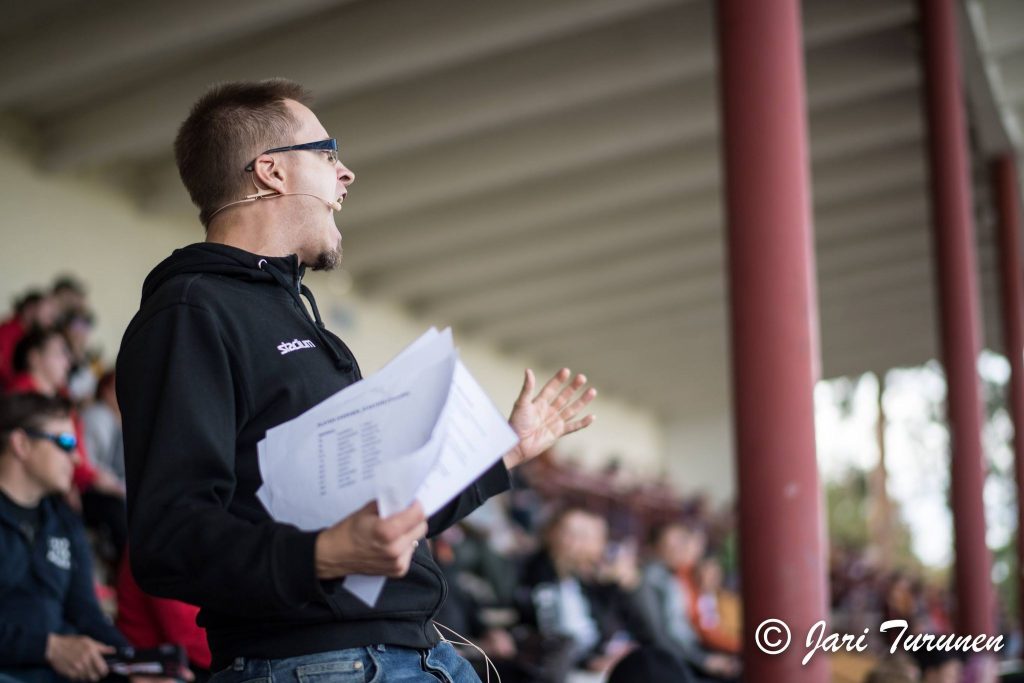 – Se tärkein ja välillä hyvinkin kriittinen hetki on ne muutamat lauseet aivan kuulutuksen alussa. ”Tänään on hyvä päivä, tänään on PELIPÄIVÄ!” Jos yleisö reagoi siihen kuten toivon, laukaisee se heti kaiken epävarmuuden ja jännityksen viimeistään pois ja voin turvallisesti päästää itseni irti.
