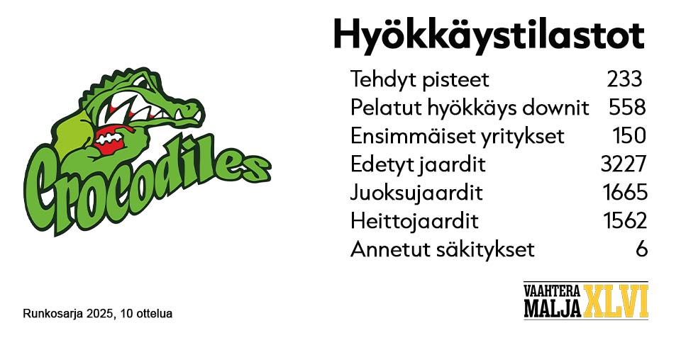 Seinäjoki Crocodiles polku Vaahteramalja XLVI -otteluun on ollut vastustajaansa kuoppaisempi. Runkosarjan rekordi 7-3 tuotti lopulta sarjataulukossa kolmannen sijan, joka toi välierävastustajaksi jo toista vuotta peräkkäin Steelersin kotikentällään. Dramaattinen välierävoitto Kuopio Steelersistä jatkoajalla syntyi pelinrakentaja Brandon Kylesin kauden parhaan pelin tuloksena. Läpi kauden Crocodilesin puolustuksen etulinjan miehitystä on pidetty yhtenä sarjan parhaista, mutta kauden lähestyessä päätöstään myös hyökkäys on päässyt tarjoamaan herkullisia hetkiä joukkueen kannattajille.