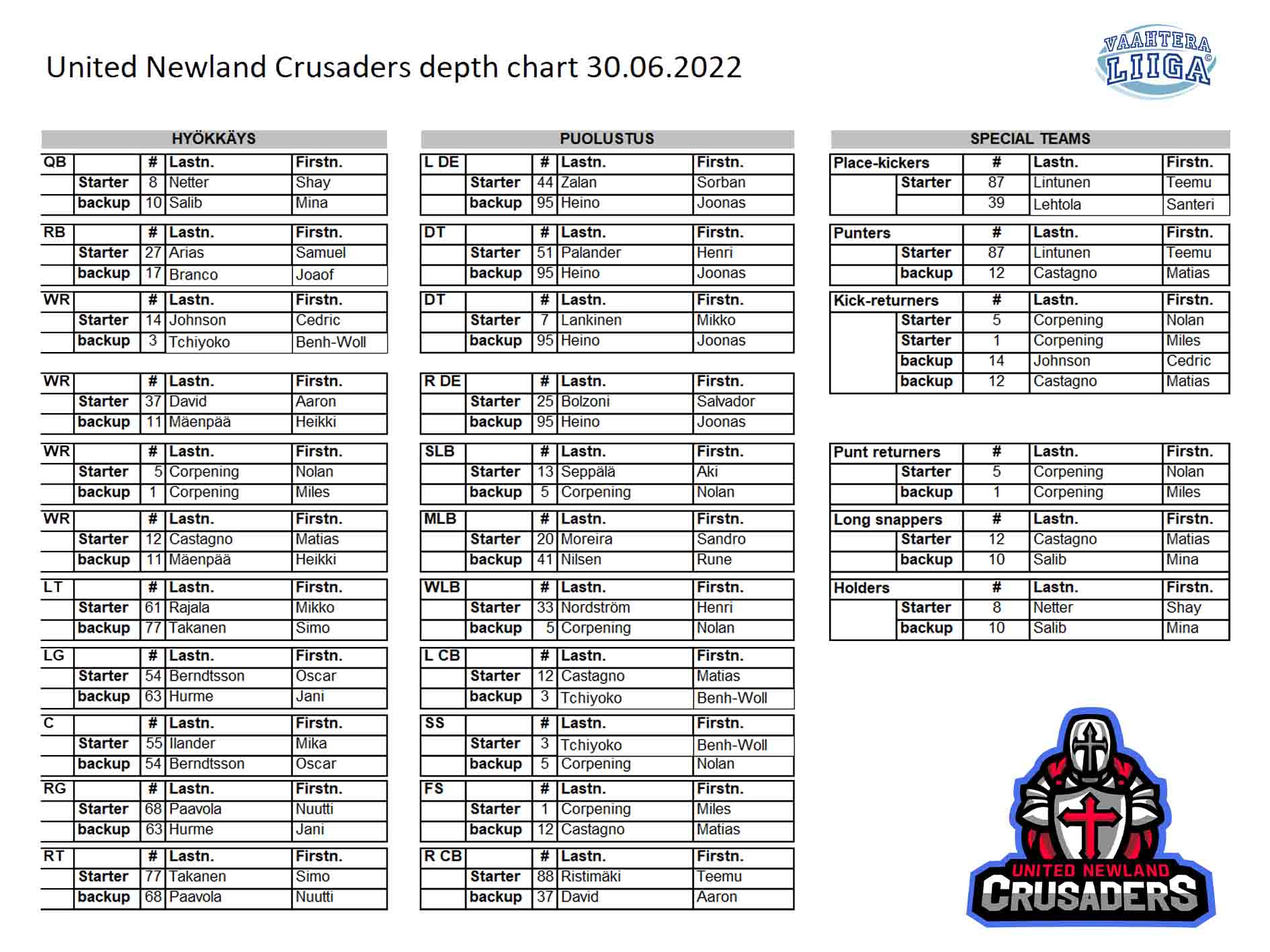 Rosterihaasteiden parissa tuskastellut United Newland Crusaders (0-4) marssittaa torstain peliin jälleen uusia vahvistuksia. Steelers-pelissä debyyttinsä tehneen Sandro Moreiran lisäksi Crusadersia vahvistaa kaksi tuoretta portugalilaista ja yksi norjalainen pelaaja.