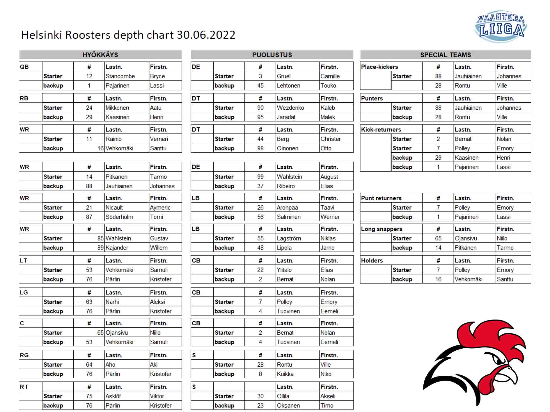 Roosters on onnistunut tauon aikana saamaan pitkää poissaolijoiden listaa lyhemmäksi ja varmoina poissa pelistä ovat ainoastaan Ambro Urjanson, Henri Väänänen, Anton Svens ja Tommy Nylund. Epävarmojen listalta löytyy yhä alkukauden ykköstykki, ranskalainen laituri Aymeric Nicault, mutta mies on kirjattu myös avauskokoonpanoon, joten back-up pelinrakentajia lukuun ottamatta peliin lähdetään rosterin ykkösmiesten johdolla.