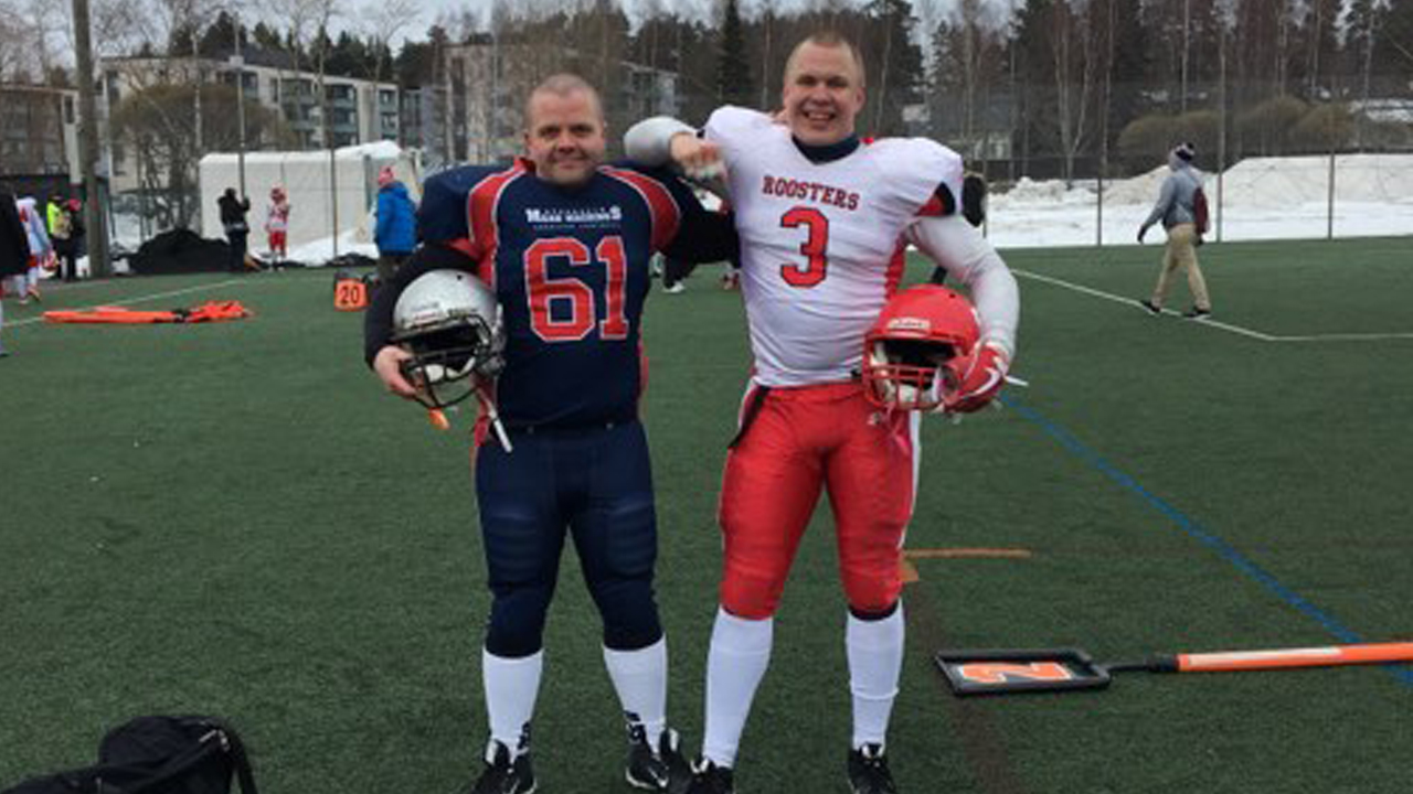 Mikael Lindroos (vas.) ja Sami Toivonen pelasivat vuosia Turku Trojansissa joukkuekavereina. Nyt he kohtasivat kentällä vastapuolilla, sillä Lindroos aloitti toisen kautensa tukholmalaisten hyökkäyksen linjassa ja Toivonen vastaavasti debytoi välivuoden jälkeen Roostersin tukimiehistössä. Kuva: Jenni Hakala