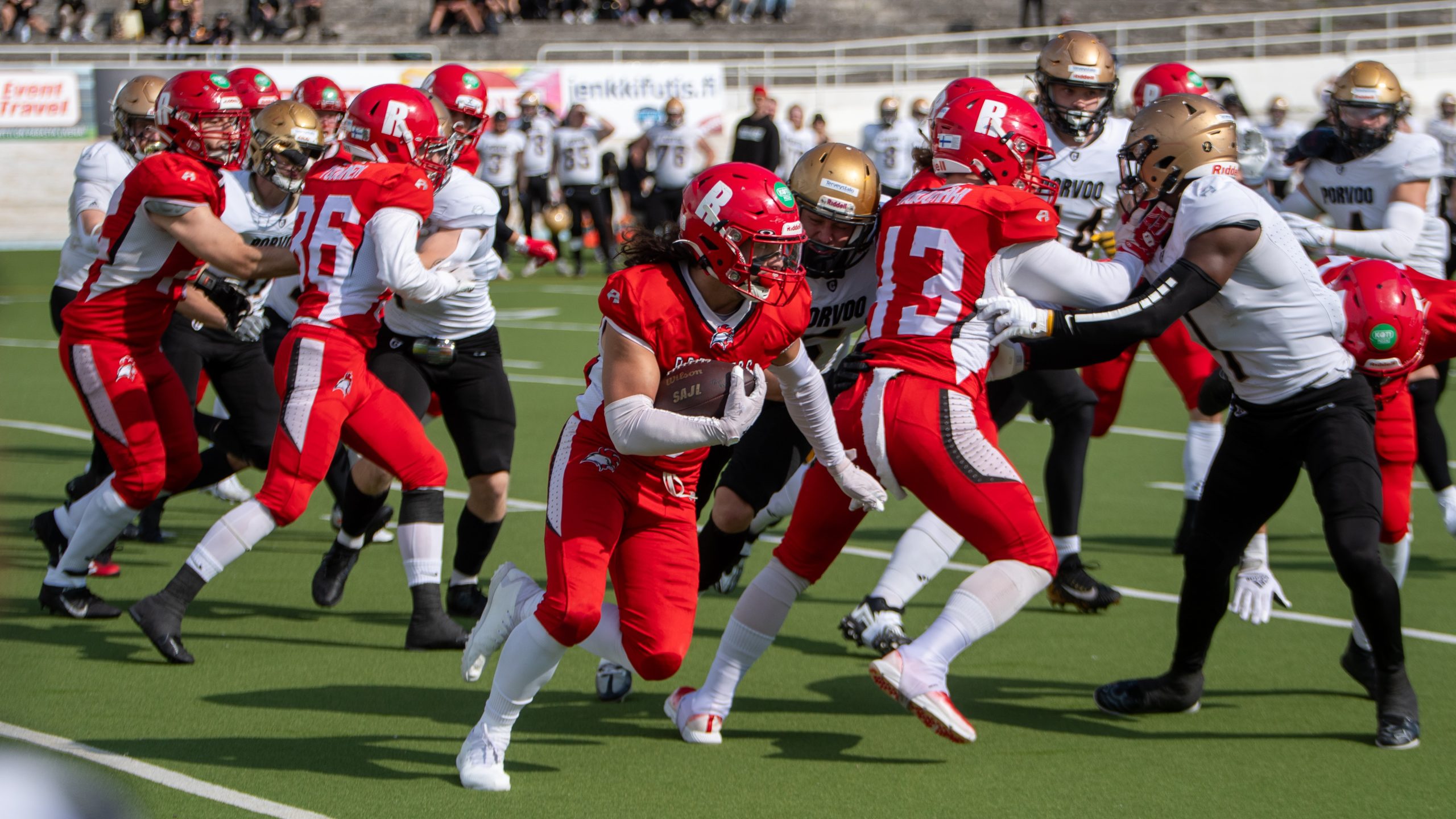 Ottelun ensimmäiseen puolikkaaseen mahtui vielä Oskari Toijalan peittämä rähmäys, Sidney Walkerin suihkukomennus, Anssi Ruohosen kaksi onnistunutta kenttäpotkumaalia sekä yksi Ethan Greenfieldin juoksema TD. Peli oli 34-7 ja hallitseva mestari on nujerrettu. Kolme pallonmenetystä, hylätty 94 jaardin TD ja suihkukomennuksen saanut jenkkivahvistus olivat liikaa porvoolaisten pelihuumorille.