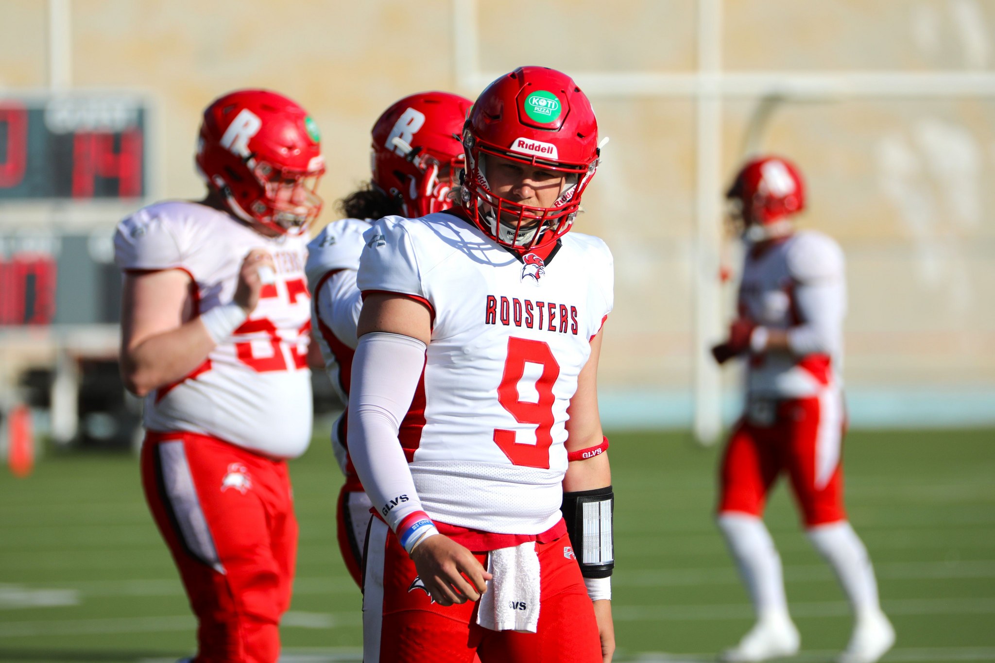 Pelin avaustouchdown nähtiinkin seuraavalla hyökkäysvuorolla, kun Roosters marssi nopeasti kenttää eteenpäin hyvillä heitoilla. Maalin kirjasi kiinniotolla Ethan Greenfield itselleen, laittaen joukkueensa 0-7 johtoasemaan. Toisen neljänneksen aikana porvoolaisetkin saivat maalihanat auki tasoittaen pelin Adam Cofieldin touchdownilla lukemiin 7-7. Ensimmäinen puoliaika ei tarjoillut enempää pistesuorituksia, joten tauolle mentiin tasatilanteessa.