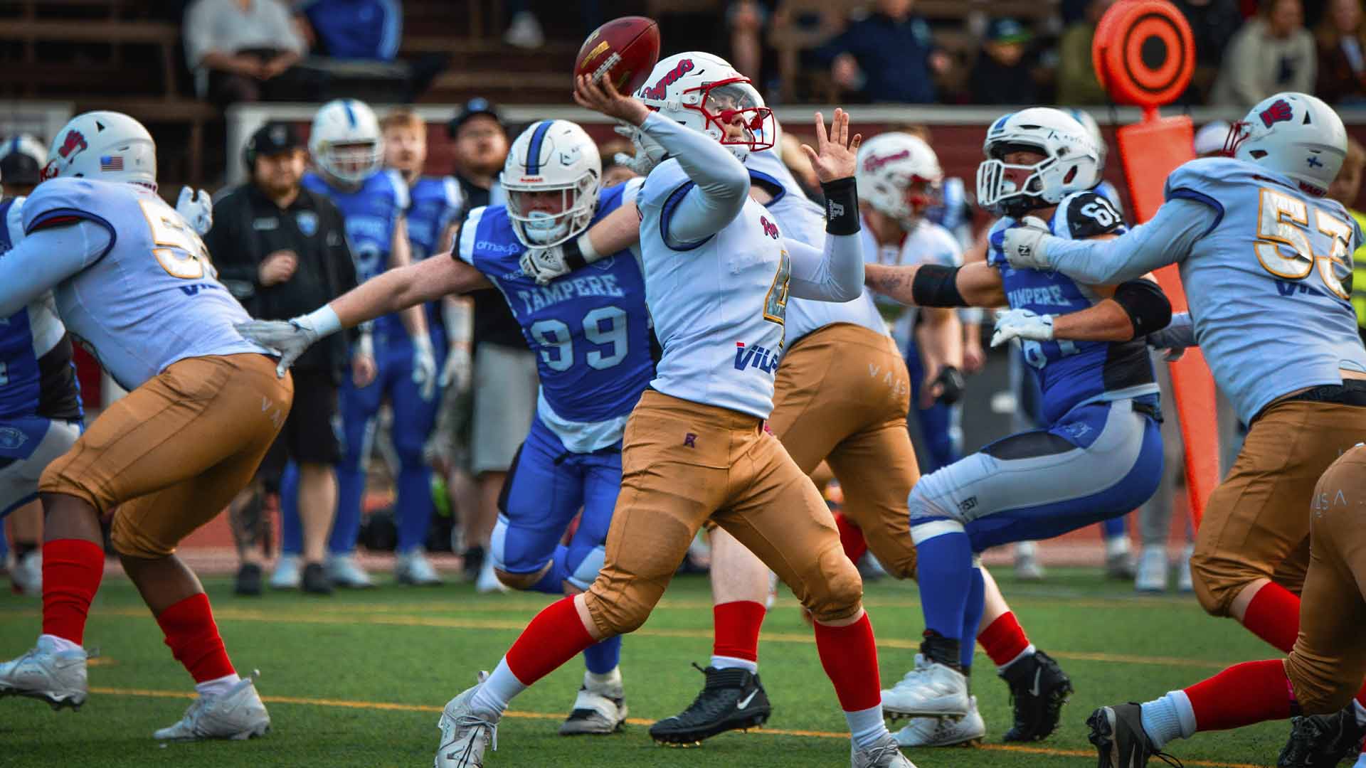 Kotijoukkue Saints lähti paluuotteluunsa haavoittuneena, kun joukkueen ykköskeskushyökkääjä David Chaves Jimenez ei loukkaantumisen takia kyennyt osallistumaan peliin. Sanotaan, että toisten epäonni on toisten onni. Perjantaina tämä osui hyvin Saintsin 17-vuotiaaseen keskushyökkääjä Konsta Mäenpäähän, joka kiitti saamastaan peliajasta ja oli yksi ottelun hahmoista. Nuorten maajoukkueessakin väläytellyt Mäenpää kantoi palloa 16 kertaa keräten juoksuillaan 94 jaardia. Erityisen nautittavaa oli seurata, miten nuori tamperelainen osasi purkaa taklauksia ja irtautua vaasalaisten pysäytysyrityksistä.