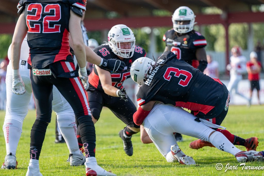 Steelersin Jamarcus Henderson (DL) antamassa taklauksen Roostersin pelaajalle. (Kuva: Jari Turunen)