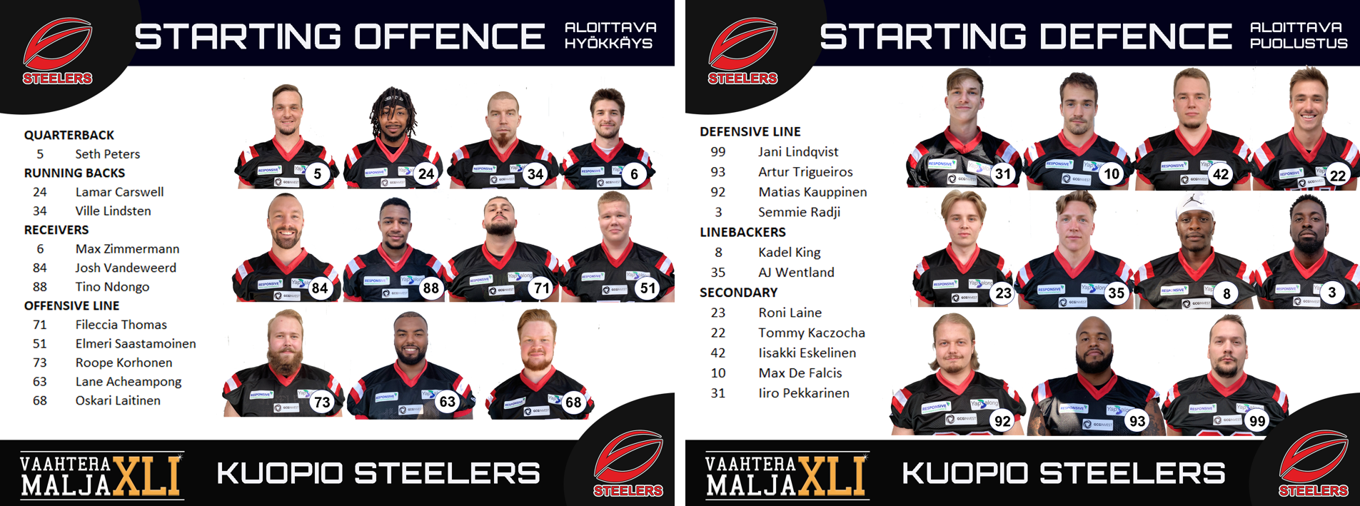 Sanotaan, että puolustukset voittavat pelejä. Lauantaina Wolverines-puolustuksella on valtava urakka edessään Steelersin monipuolisen hyökkäyksen pysäyttämiseksi. Joukkueen kapteeni Ville Valasti on pelannut ajoin murskaavan ylivoimaisesti ja tulee olemaan finaalissa yksi niistä Wolverines-pelaajista joiden onnistumista tarvitaan 110% Steelersin yllättämiseksi. Huikeaa kautta ovat pelanneet myös ruotsalaiset tukimiehet William James ja Sebastian Gauthier, joilla tulee olemaan iso rooli Steelersin Carswelin pysäyttämisessä.