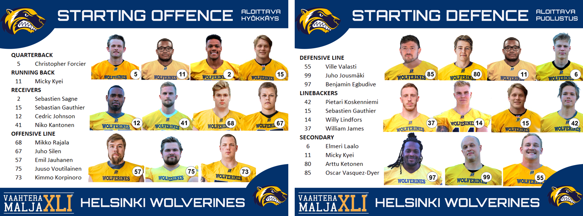 Wolverines on peluuttanut puolustuksen takakentällä nuoria lupaavia pelaajia, joilla on valovoimainen tulevaisuus Vaahteraliigakentillä. Lauantaina Tino Ndongon kaltaisten vauhtikoneiden pysäyttämiseen tarvitaan kokemusta. Vaahteramaljaan toisen kulmapuolustajan paikalle avaukseen on nostettu Oscar Vasquez-Dyer ja todennäköisesti myös tutkapari Kyei-Sagne jakaa vastuuta Ndongon varjostamisessa. Tukimiehistöön palaavat puolustusvoimien aikataulujen armoilla pelaava Willy Lindfors sekä ikävän näköisesti Royals pelissä loukkaantunut Janne Lahikainen, joka johti avauspelin jälkeen joukkueen taklaustilastoja.
