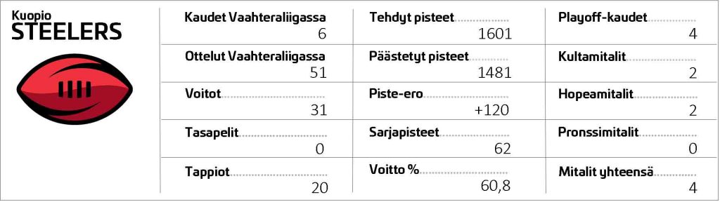 Kuopio Steelers aloittaa viidennen perättäisen kautensa Vaahteraliigassa. Seuran menestys ylimmällä sarjatasolla on ollut huikeaa. Kuopiolaiset ovat yltäneet nykyjoukkueensa kaikilla liigakausilla Vaahteramaljaan ja voittaneet mestaruuden nyt kahdesti perättäin.