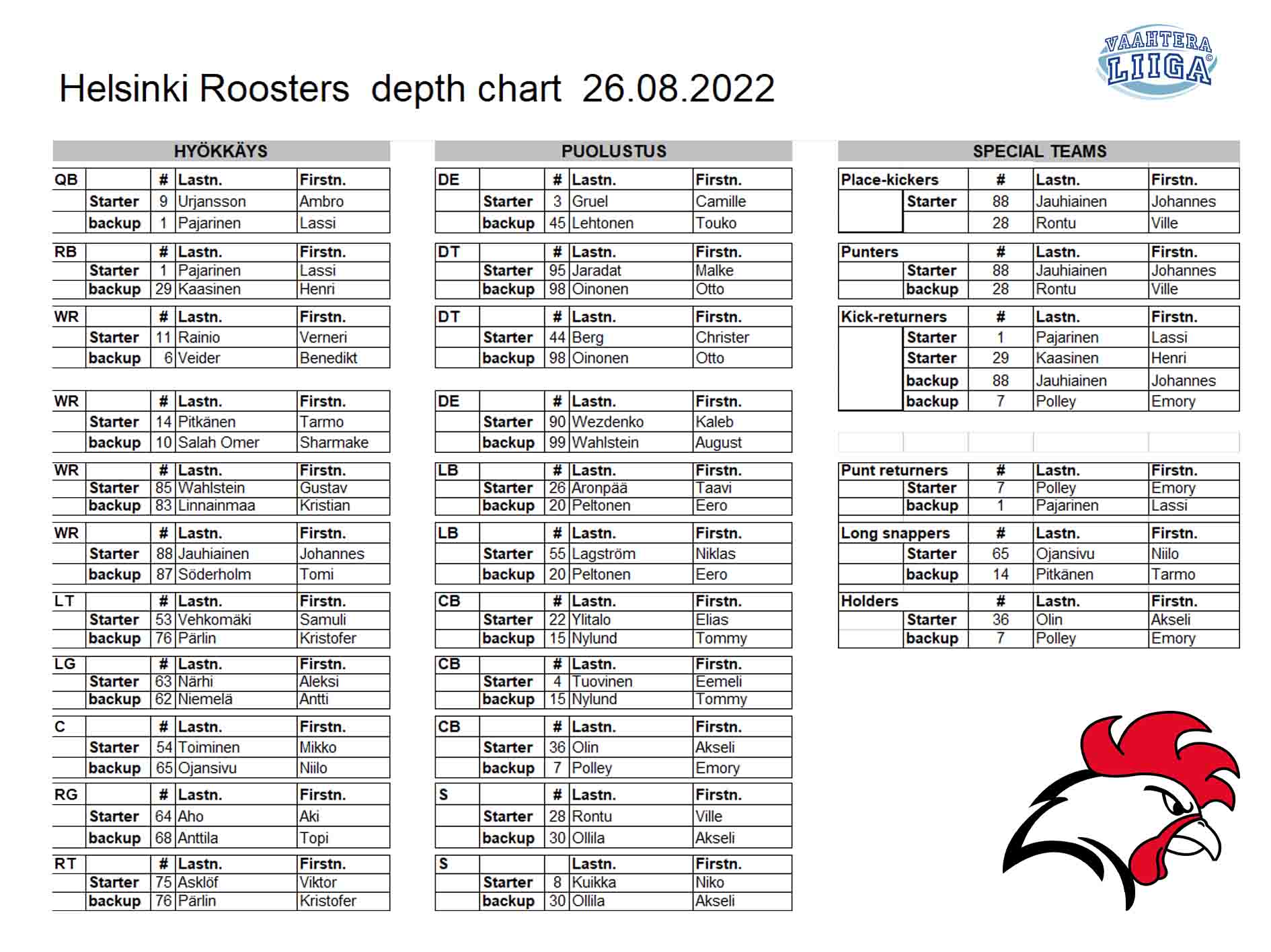 Roosters julkaisi ratkaisupelin alla alustavan rosterin, joka on yllätyksiä täynnä. Tukku avainpelaajia on ilmoitettu poissaolijoiksi mukaan lukien avaava pelinrakentaja Bryce Stancombe.  Poissaolijoiden listalta löytyvät myös Aymeric Nicaultin ja Nolan Bernatin nimet. Joukkueen kolmas jenkkivahvistus Emory Polley on merkitty otteluun epävarmojen listalle.  Avaavan pelinrakentajan paikalla pelaa Ambro Urjansson, joka on saanut joukkueen aiemmissa otteluissa peliaikaa, mutta rajallisesti QB:n roolissa.