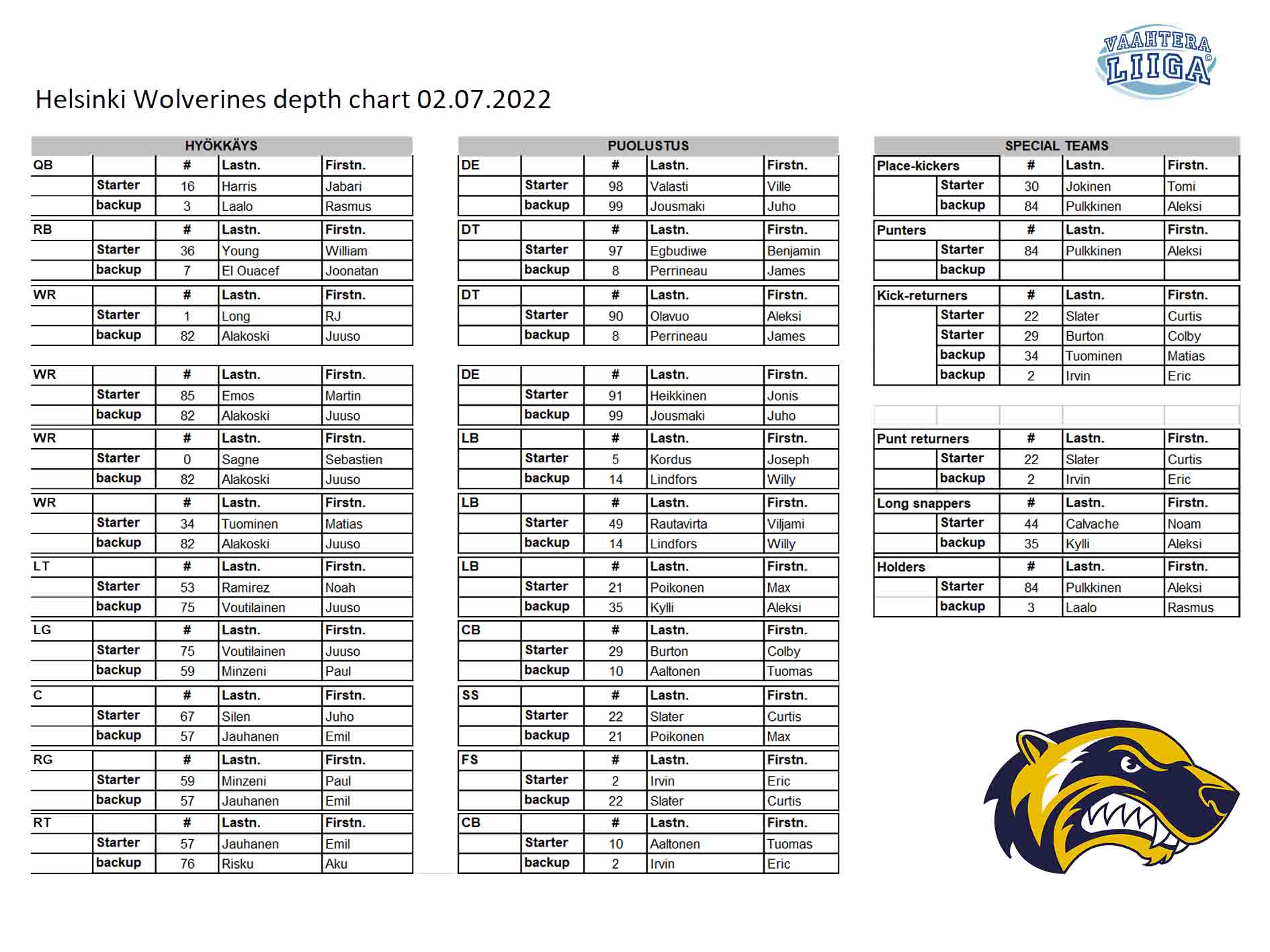 Ottelussa liigadebyyttinsä tulee rosterin mukaan tekemään myös tukimies Noam Calvache, joka on peliin kirjattu avaavaksi long-snapperiksi.