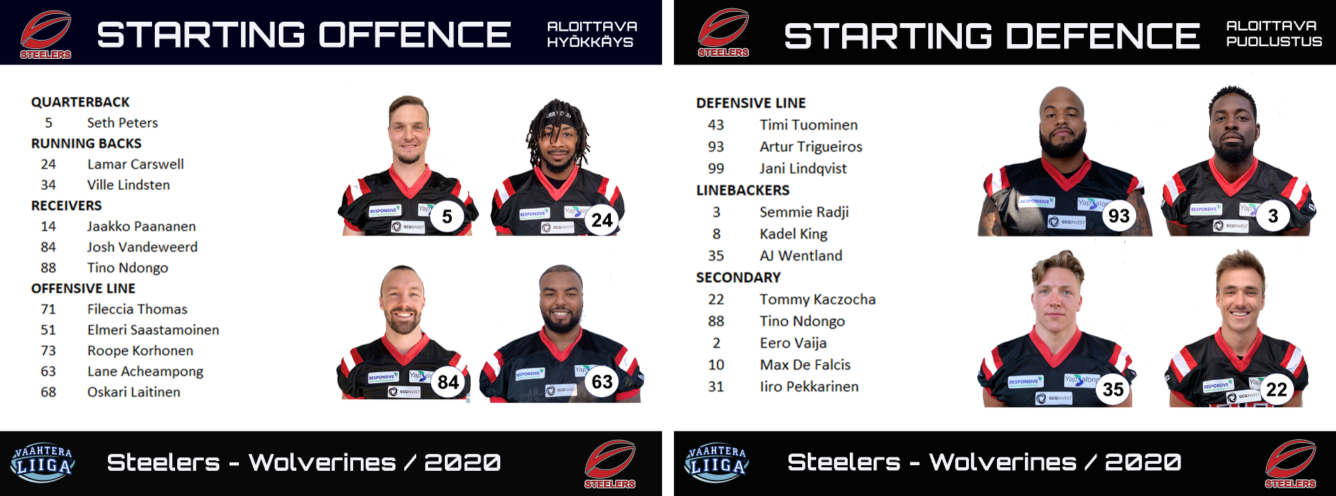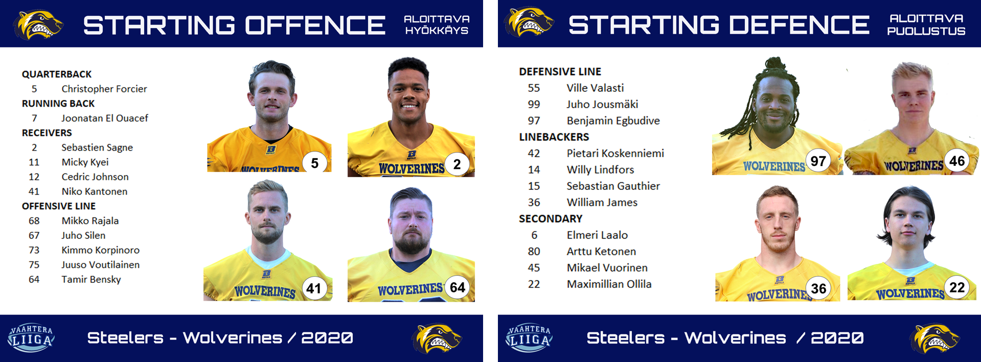 Lauantain otteluun Wolverines on viime hetkellä lisännyt useampia Saksasta saapuneita maan kakkosliigan vahvistuksia, joiden taso on vielä täydellinen arvoitus. Keskushyökkääjä Alex Funk on merkitty joukkueen depth charttiin pirteästi pelanneen Joonatan El Ouacefin kakkosmieheksi. Täydentäjiä löytyy myös muille pelipaikoille. Avaava kokoonpano on parsittu kasaan terveenä olevista miehistä, joita ryhmitellään kentälle vastustajan vahvuuksia huomioiden. Erinomaisen avauspelin pelanneet ruotsalaistakamiehet William James ja Sebastian Gauthier asettuvat tukimiesten paikalle pysäyttämään Lamar Carswellin juoksu-uhkaa. Tukimiehistöön palaa Willy Lindfors, jonka kautta rikkoo tänä vuonna varusmiespalvelus. Joukkueeseen kiinnitetty yhdysvaltalainen veteraanipelaaja Oscar Vazquez-Dyer on lisätty rosteriin niinikään tukimiehen paikalle myöhään perjantaina, mutta konkarin nykykunto nähtäneen vasta lauantaina. Hyökkäyksessä Niko Kantonen korvaa aiemmin avaukseen merkityn Phung Nguyenin.