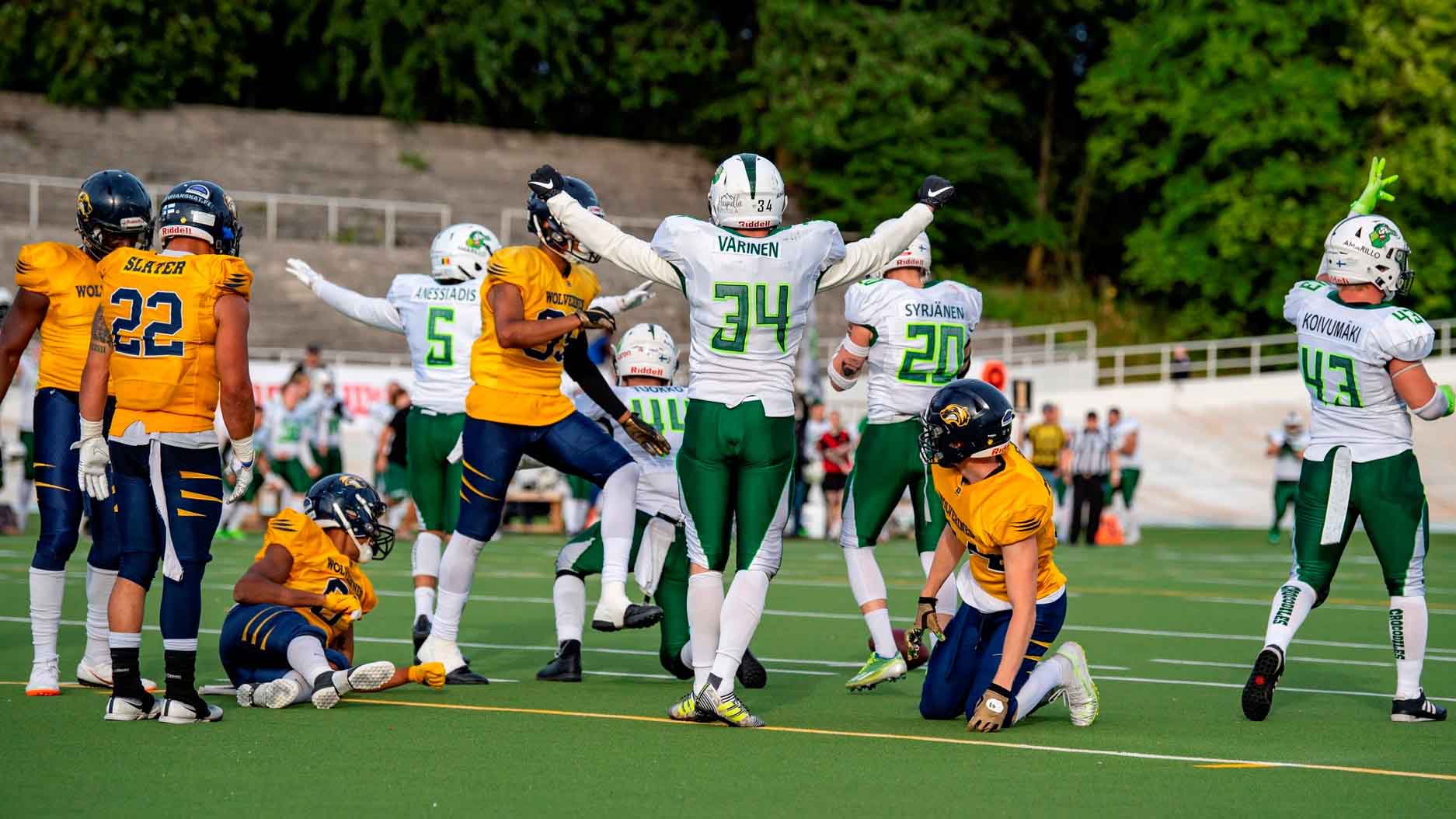 Lauantain vaahteraliigapelissä oli panosta ja tunteita katsomoihin jännitettäväksi. Kuten joukkueiden kohtaamiset viime aikoina ovat olleet, taas ratkaisua jouduttiin hakemaan pelin viimeisille hetkille saakka. Wolverines kiri Crocojen kahden TD:n eron kiinni neljännen neljänneksen lopulla, mutta pelikelloon jäi aikaa vierasjoukkueen yhteen draiviin. Seinäjokiset painoivat pallon väkisin Velodromin itäpäätyyn, ja ratkaisijaksi nousi huikean määrän työtä urakoinut Christian Powell iltapäivän ainoalla kiinniotollaan.
