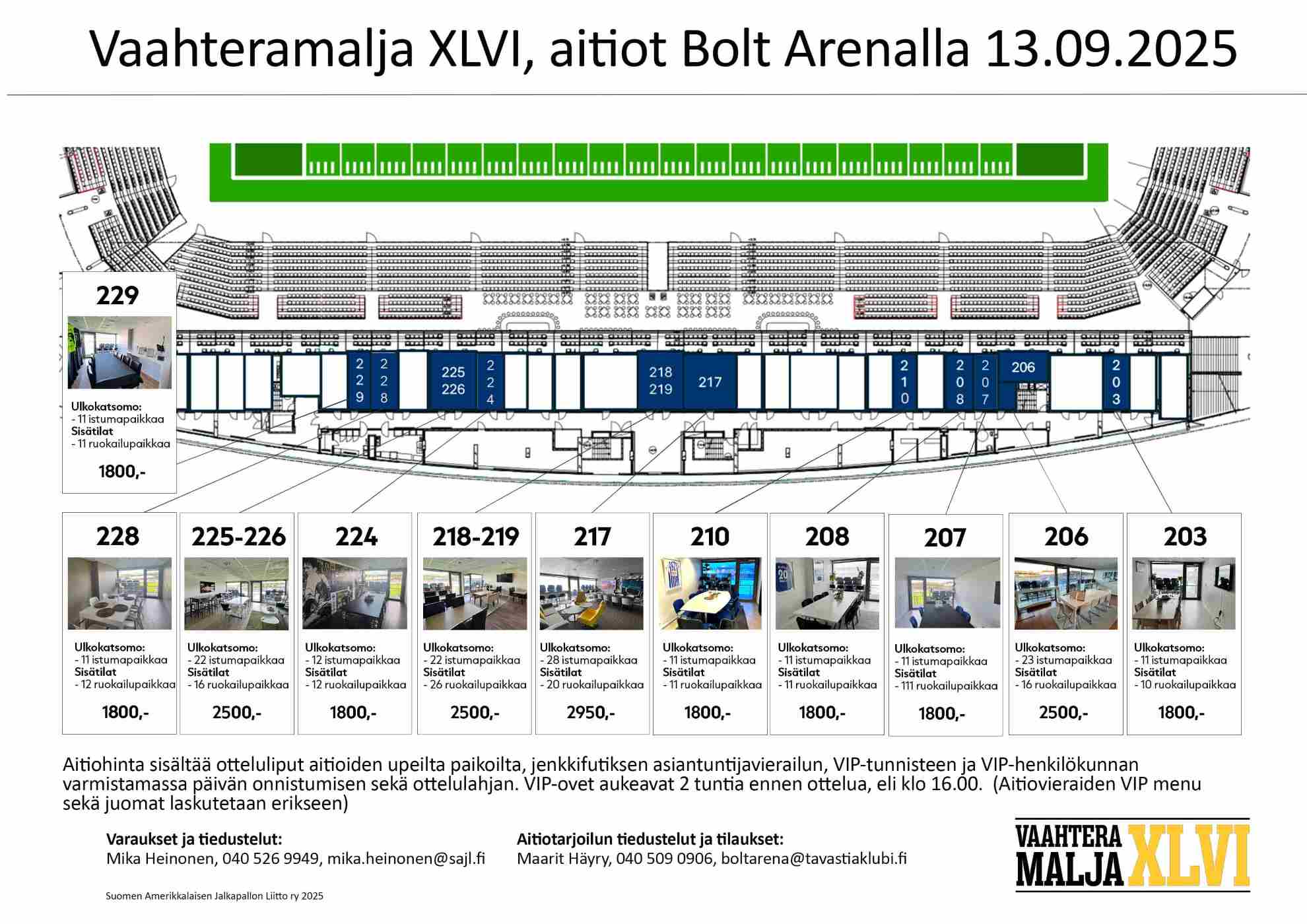 Vaahteramalja XLVI potkaistaan käyntiin klo 18:00. Bolt Arenan portit aukeavat klo 17:00. Musiikkia, urheilullista tailgate-meininkiä ja paljon ohjelmaa koko perheelle sekä Street Food herkkuja kaupungin parhaista ruokarekoista Bolt Arenan viereisellä Saharan kentällä jo klo 12:00 alkaen.