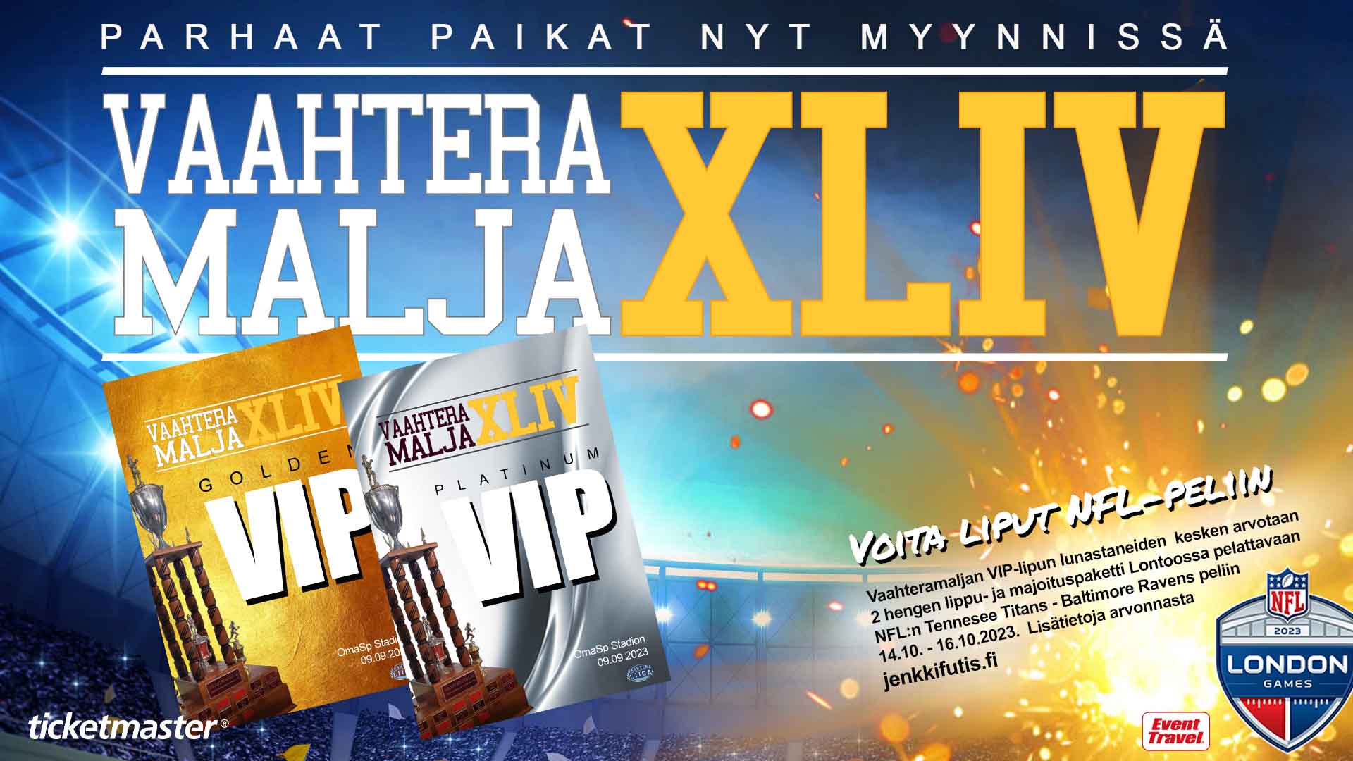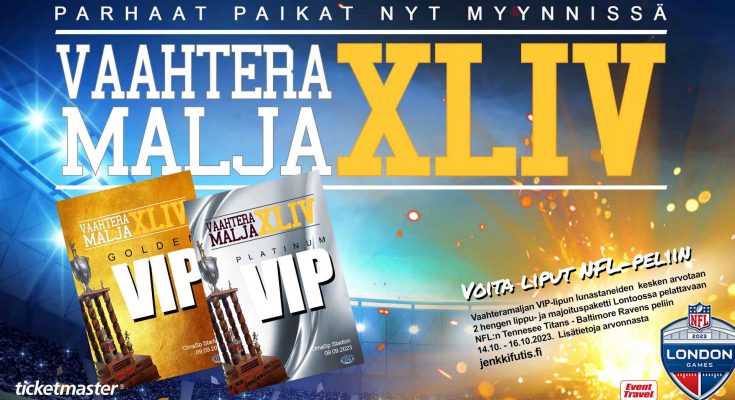 SAJL ja jenkkifutisliiton yhteistyökumppani Event Travel arpovat VIP-lipun lunastaneiden kesken kahden hengen lippu- ja majoituspaketin Lontoossa 15.10.2023 pelattavaan Tennessee Titans – Baltimore Ravens otteluun. Arvonta suoritetaan Vaahteramalja XLIV-pelin puoliajalla.