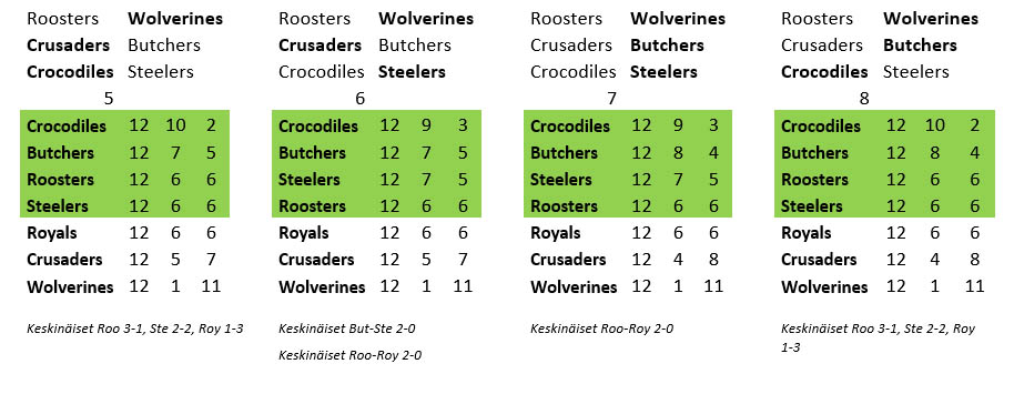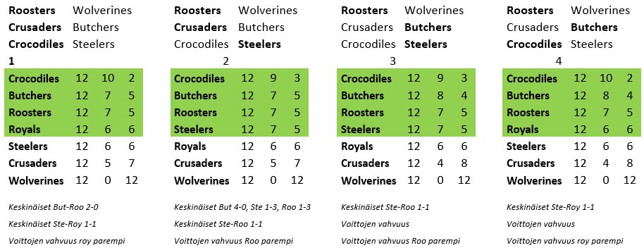 Jos Roosters voittaa Wolverinesin (skenaariot 1-4), jää kahden viimeisen ottelun eri variaatioita jäljelle neljä. Kaksi skenaarioista nostaa Royalsin välieräpeleihin, toiset kaksi avaa Steelersille mahdollisuuden olla mukana mestaruustaistelussa seitsemättä perättäistä kertaa. Roostersin todennäköinen voitto vie samalla perjantain Crusaders-Butchers peliltä roolin pois playoff-taistelun näkökulmasta.