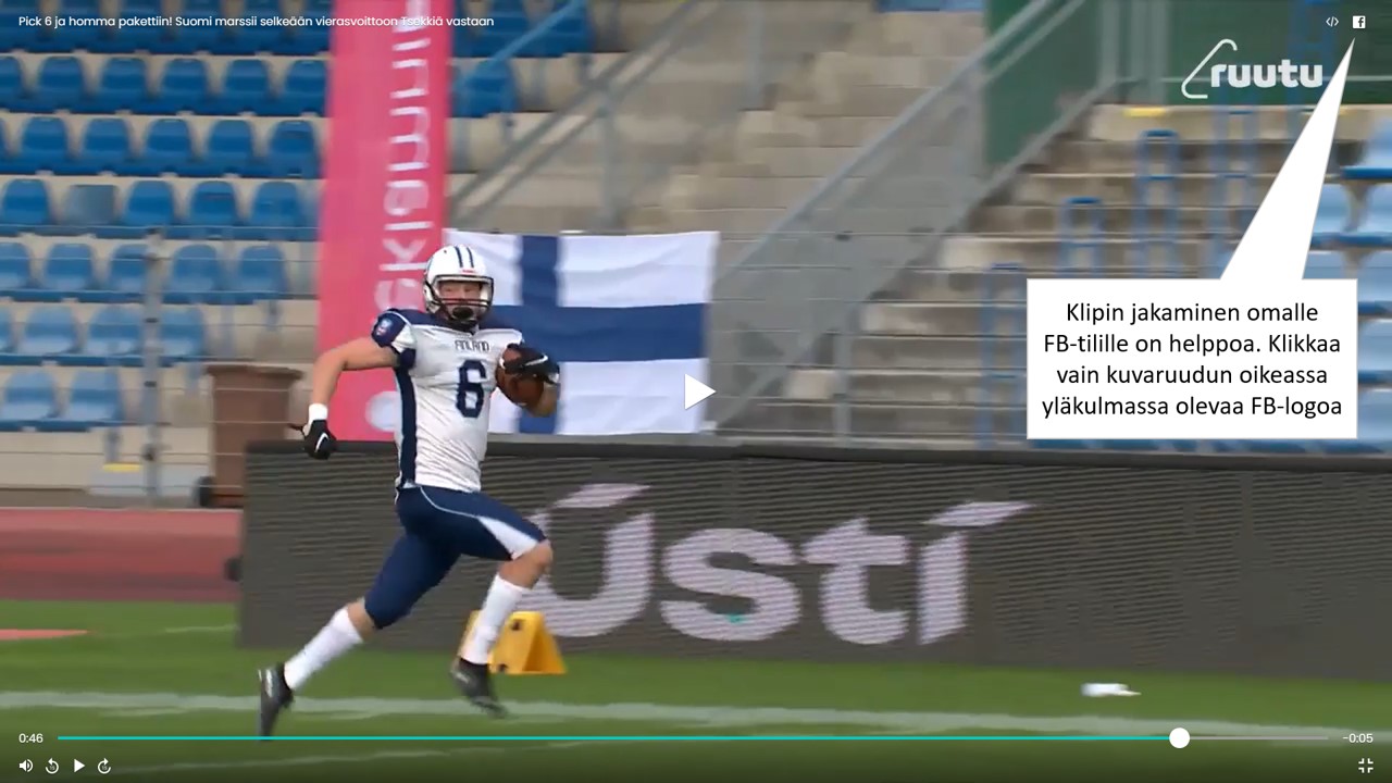 Ruutu-klipin jakaminen on helppoa. Jokaisessa tallenteessa on FB-kuvake kuvaruudun oikeassa yläkulmassa (ks. kuva alla). Kuvaketta klikkaamalla pääset jakamaan klipin seuraajillesi.