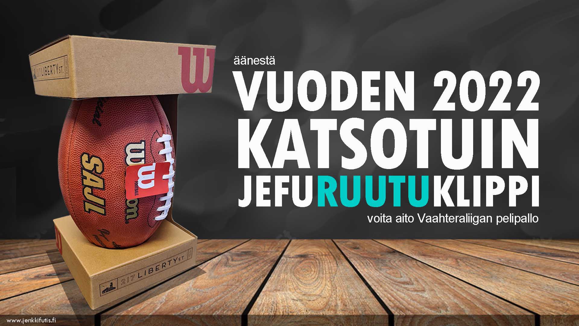 Käy Ruutu-palvelussa ja valitse omasta mielestäsi vuoden paras ja mahdollisesti katsotuin klippi. Se voi olla ottelun huippuhetki tai haastattelu. Jaa valitsemasi klippi Facebookissa. Tägää postauksesi #jefuruutuklippi2022 ja osallistut arvontaan, jossa palkintona aito Vaahteraliigan pelipallo 2023. Arvontaan osallistuvat myös jaettuja klippejä peukuttaneet jefufanit.