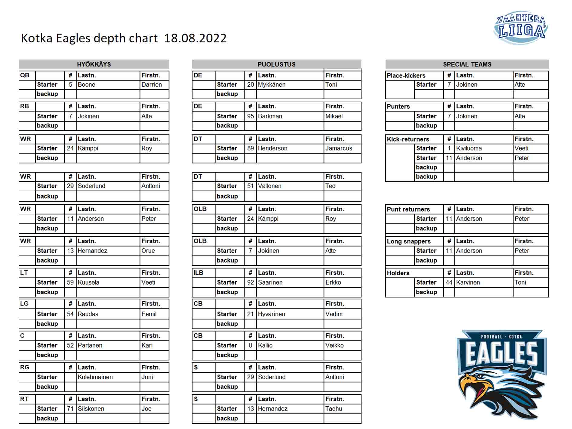 | Jokinen A kickoff 35 yards to the WOL45, Poikonen M return 10 yards to the EAG45 (Kivi D). | |||