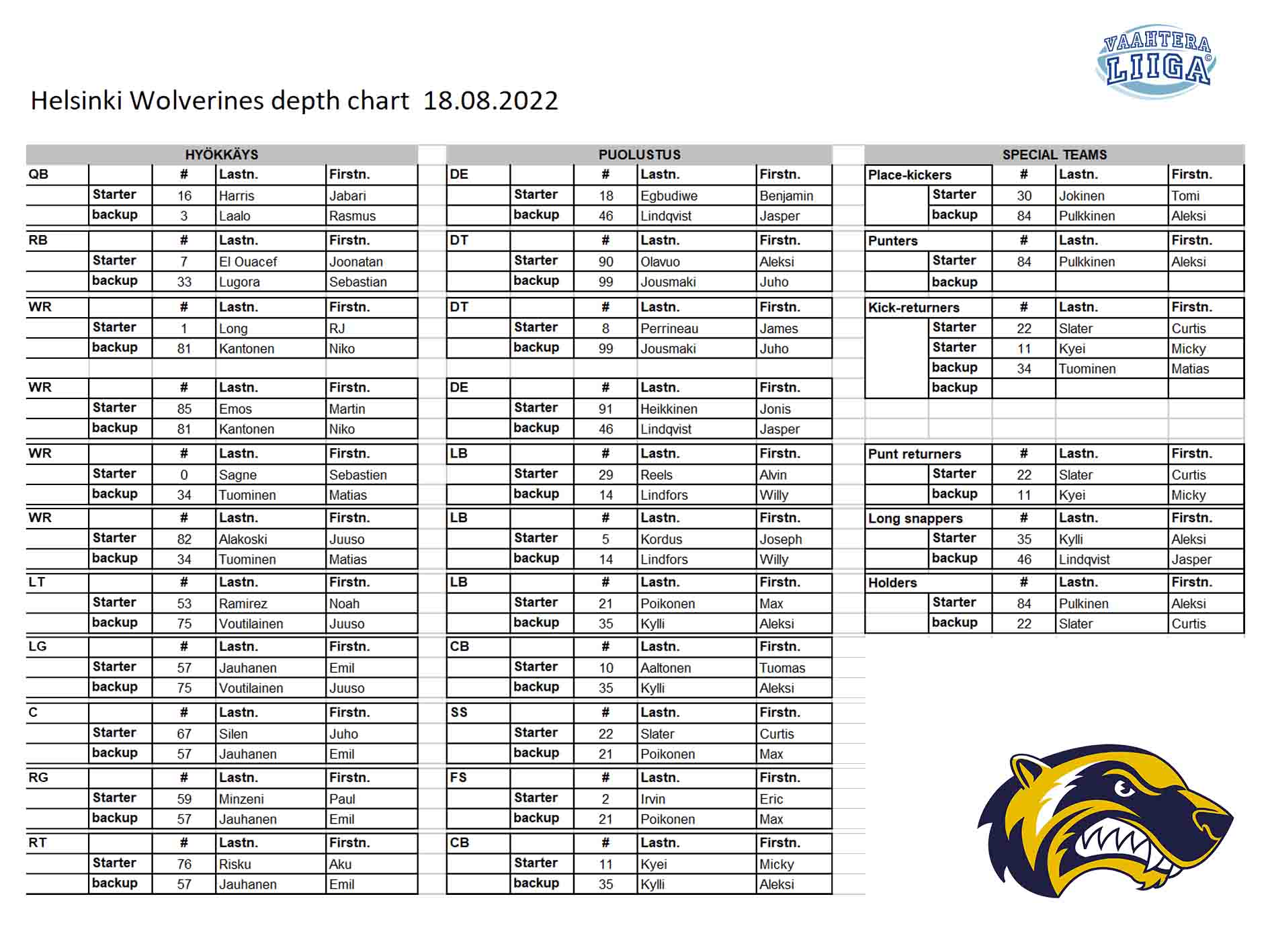 Helsinki Wolverines lähtee runkosarjan viimeiseen kotipeliinsä 35 miehen rosterilla. Rosterista puuttuvat mm. yhdysvaltalainen takapuolustaja Darius Lewis sekä keskushyökkääjä William Young. Joukkueelta löytyy kuitenkin reservistä korvaavia miehiä ja torstaina Wolverines-puolustuksessa pelaa kaksi yhdysvaltalaista tukimiestä, Joseph Kordus ja Alvin Reels.